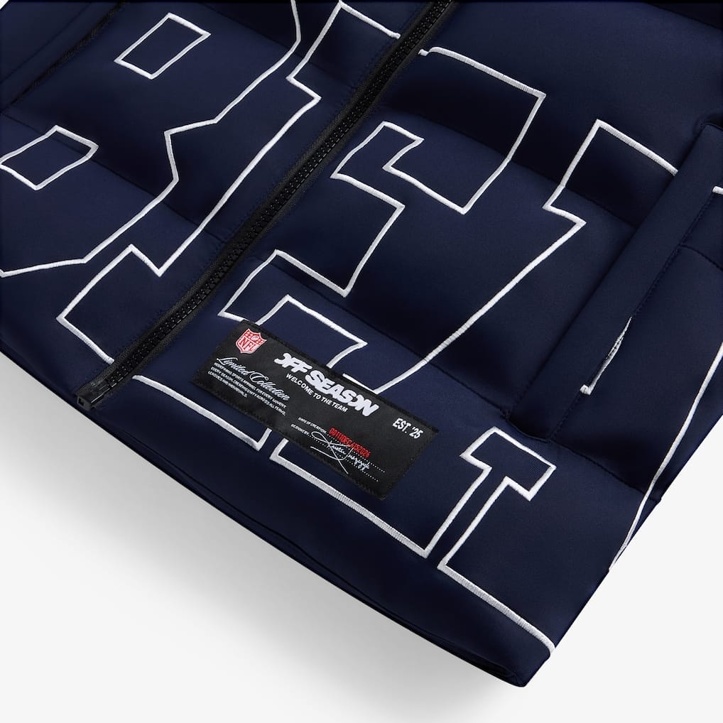 This Off-Season x NFL Puffer Jacket is designed with embroidered team logos, a 3D NFL silicone patch, and hand-applied graphics, it blends fashion and function. Featuring a corduroy lining, padded polyester fill for warmth, water-resistant finish, multiple pockets, and a custom jacquard chest panel, this heavyweight vest is built for game-day comfort and durability.