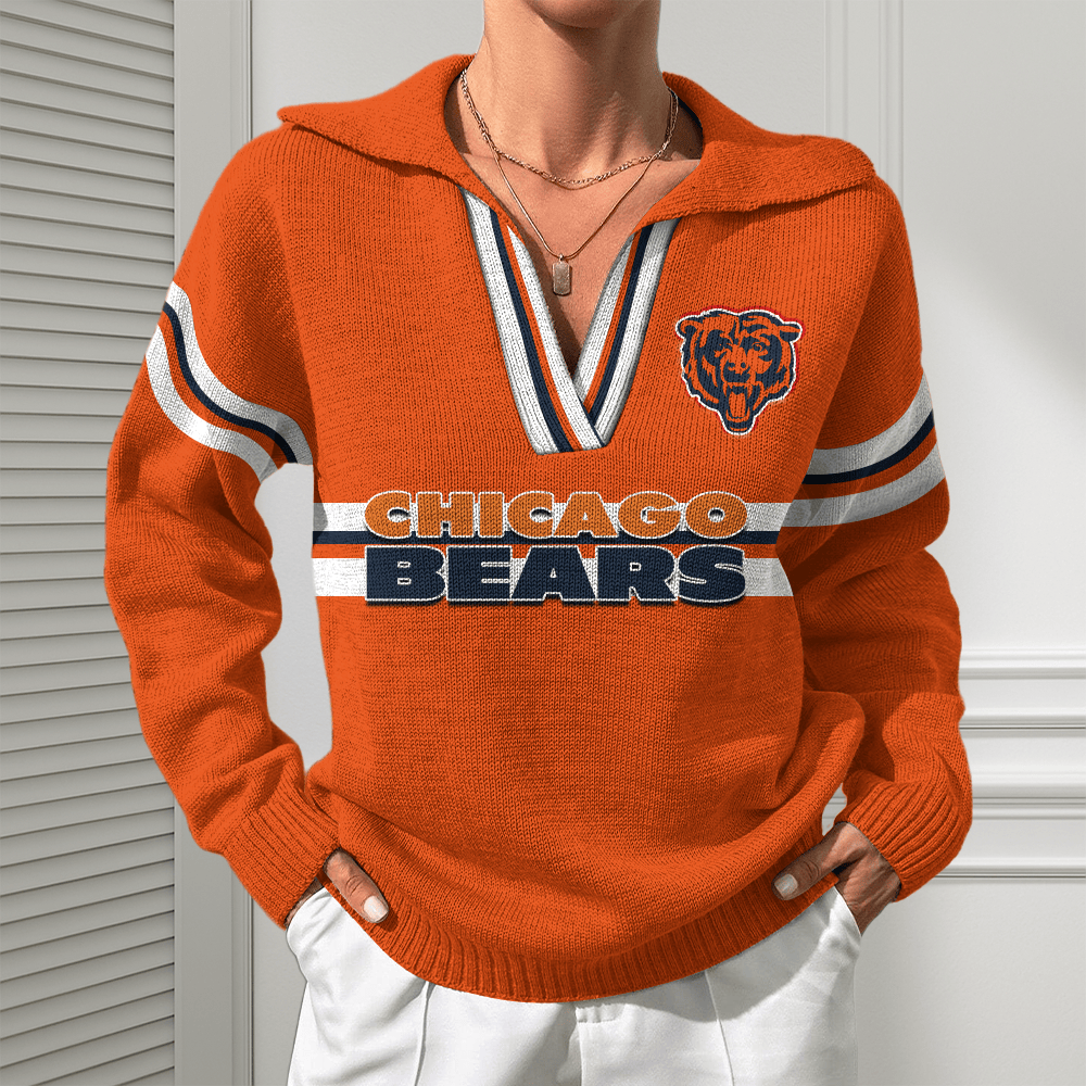 Chicago Bears Women Customized Name V-Neck Hooded Knit Sweater AMCCLG002360