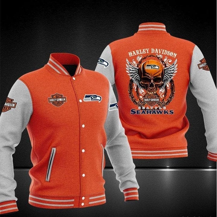 Harley Davidson x NFL Team Seattle Seahawks Baseball Jacket AMCCLG001278 Orange Skull